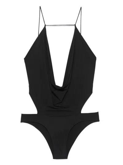 Plunging draped neckline Adjustable back laces; open back Side cut-outs at waist Medium coverage briefs Black color 73% Polyamide, 27% Elastane Made in Italy