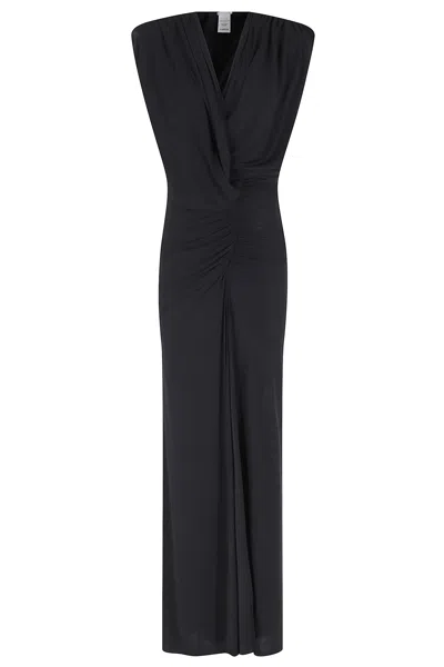Category: Dress Item: Meghan Long Dress Brand: Amazuin Color: Black Neckline: Deep V-neck, Padded shoulder straps, Sleeveless Details: Deep side slit, Draped SIZE AND FIT Fit: Fitting Line: Straight