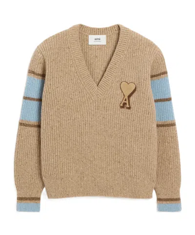 Ami offers a beige wool sweater that embodies casual elegance. The deep V-neckline and dropped shoulders create a relaxed silhouette, while the ribbed texture adds visual interest. Brown and light blue stripes adorn the sleeves and cuffs, paired with a signature logo patch on the chest. This sweater combines refined detailing with a comfortable fit, making it perfect for casual gatherings or preppy ensembles.Specifications - Material - Wool Neckline - Deep V Design - Dropped shoulders Texture - Ribbed Stripes - Brown and light blue Logo - Signature patch on chest Fit - Comfortable