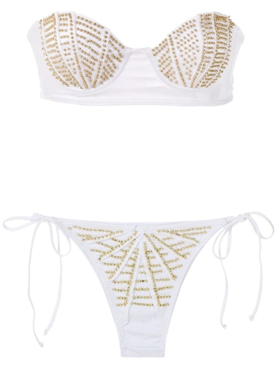 White bandeau bikini set from Amir Slama featuring a balconette top with side wires for added support, a strapless design, a post back closure, a brazilian style bottom with side tie fastenings, beaded embroidery, a lining, an elasticated trim, a textured style and a mid-weight stretch fabric. This item is true to fit. Swimwear must be tried on over your own garments. This item provides a low body coverage. We recomend buying the next size up for bigger breasts sizes.