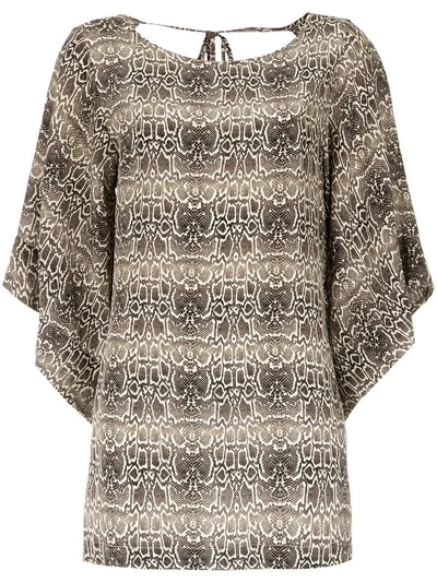 Beige silk python print shift dress from Amir Slama featuring a round neck, a scoop back, a back tie fastening, a short length and seven eighth length sleeves. Silk 100%