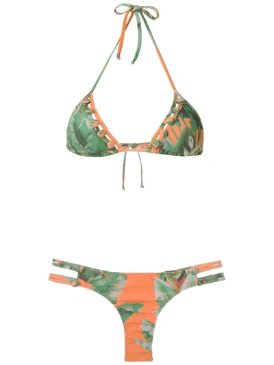 Green and orange triangle bikini set from Amir Slama featuring a triangle top with a removable bra support, cut out details, decorative buttons, a back tie fastening and a double straps bottom with a side button fastening, an all-over print, an elasticated trim, a lining and a stretch fabric with fresh touch. Please note the print may differ slightly from the item pictured.