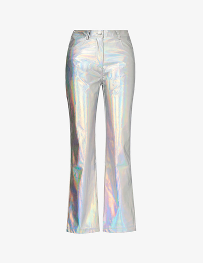Amy Lynn often draws inspiration from the scintillating disco age when conjuring its unapologetically playful pieces. But, by the appearance of the Space trousers, it seems the label has soared straight across the universe to faraway stars. Crafted from buttery faux leather, this pair is fashioned to a mid-rise waist and falls to a slender, straight-leg silhouette, cloaked in a metallic sheen with enough luminosity to rival the iridescent hues of galaxies swirling above.| Amy Lynn faux leather trousers50% polyester, 50% polyurethaneButton, hook-and-eye and zip-fly fasteningRegular fit, mid-rise, straight leg, structured waistband with belt loops, four pockets, rubberised brand appliqué at back, holographic finishDry cleanTrue to sizeSize small: rise 12in / 31cm, inside leg 29in / 74cm, leg opening 16in / 41cmModel is 5ft 10in/1.78m and wears a size smallMidweight, non-stretch