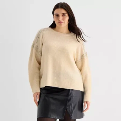 Plus Womens Crew Neck Embellished Long Sleeve Pullover Sweater In Sand