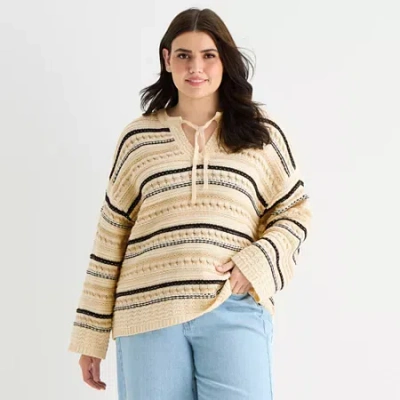 ANA Plus Womens Split Tie Neck Long Sleeve Pullover Sweater In Sand