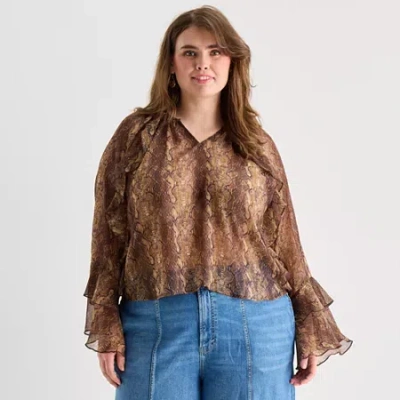 Ruffle Womens Plus Y Neck Long Sleeve Blouse In Brown