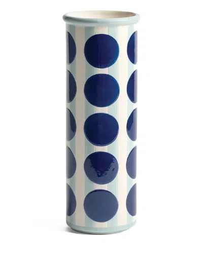 Inspired by vintage folk quilts, &k Amsterdam's 'Patch' vases imbue spaces with a touch of retro chic. Crafted from stoneware, these intricately hand-painted pieces reflect the Dutch brand's playful spirit. 'Patch Dot' combines vertical stripes and circles in a bold composition. Pale blue stripes sit beneath rows of graphic dots in rich, dark blue. The cylindrical vase is finished with a high-gloss glaze that catches the light, giving instant character to floral arrangements.