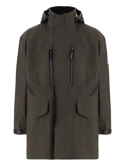 Jacket made of nylon High collar Adjustable hood Long sleeves with adjustable cuffs Front closure Two vertical chest pockets with zip closure Two lower pockets with flaps Logo detail on the sleeve Straight hem Dark khaki Made in Vietnam Composition: 100% nylon