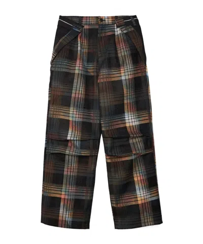 Flannel trousers featuring check details, belt loops, four-pocket styling, a zip fly, darts at the knees and a layered design.