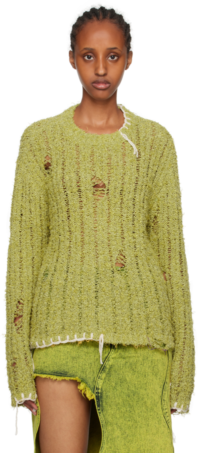 Open knit cotton- and linen-blend sweater. · Distressing and loose thread detailing throughout · Crewneck Supplier color: Green
