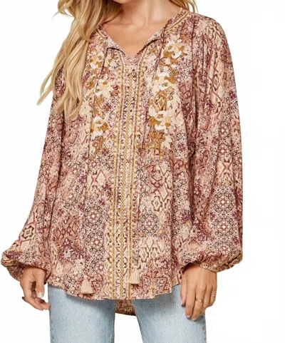 ANDREE BY UNIT Embroidered Peasant Top In Magenta & Rust In Brown