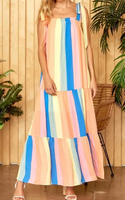 Style this maxi with your favorite statement necklace and sandals for the perfect look.This dreamy, boho-inspired maxi dress features a flowy, tiered silhouette with vertical pastel stripes in shades of blue, peach, yellow, and pink. The adjustable bow-tie shoulder straps add a delicate, feminine touch, while the relaxed fit ensures effortless comfort. Perfect for warm weather, vacations, or summer gatherings, this dress pairs beautifully with sandals or wedges for a light and airy look.