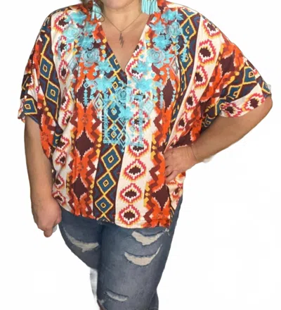 ANDREE BY UNIT Printed Poncho Top In Orange/turquoise In Multi