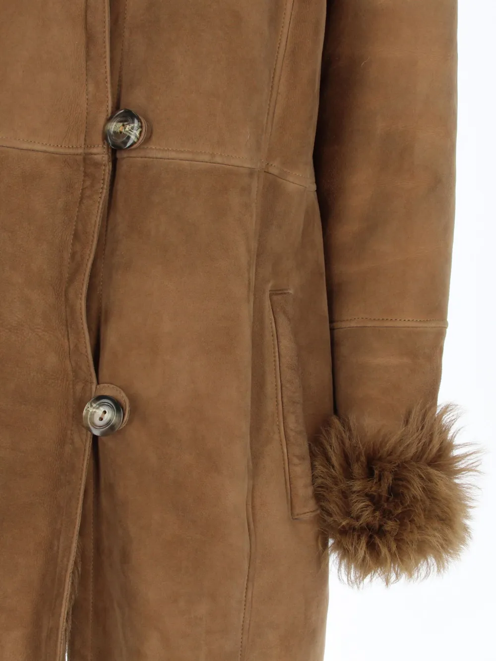 circa 1990s brown calf suede front button fastening stand-up collar long sleeves two side welt pockets shearling lining straight hem