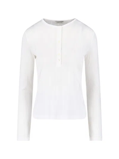 Anine Bing perforated t-shirt in white fabric with openwork pattern, crew neck, long sleeves, button closure, straight hem. Composition: 65% Polyester, 35% Rayon