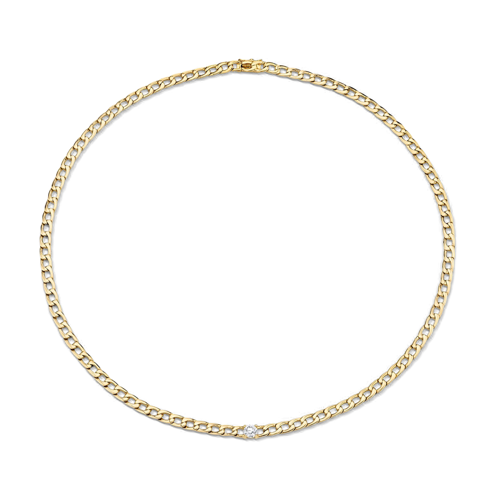 Anita Ko Plain Chain-Link Choker in 18K Yellow Gold/White Diamond: Resting right above the collarbones, this 18-karat yellow-gold chain is detailed with a sparkly, prong-set diamond in the center. Layer it with your other favorite necklaces or let it shine solo—either way, it’s a simple yet striking addition to any neckline.18k yellow gold, white diamond Chain: 16" Made in USA.