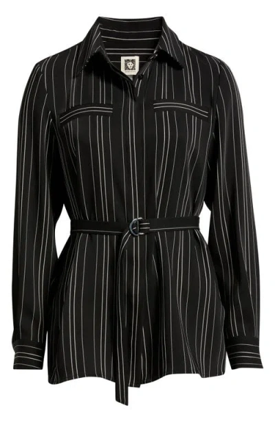 ANNE KLEIN Pinstripe Belted Button-up Tunic In Black