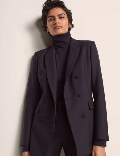 From the Core Collection. Cut in a double-breasted silhouette, Another Tomorrow's jacket is crafted of merino wool. This piece's peak lapels and tonal button closures offer sleek styling. Peak lapels Long sleeves with button cuffs Double-breasted button front Waist flap pockets Back slits Lining: 92% cupro/8% elastane 100% super-fine ethical merino wool Dry clean Made in Italy SIZE & FIT About 30" from shoulder to hem Model measurements: 5'10" tall Model is wearing a US size 4 ABOUT THE BRAND Vanessa Barboni Hallik founded ready-to-wear label Another Tomorrow with a mission to tackle ethical issues and transparency within the fashion business. Each collection reflects the designer's penchant for refined silhouettes, easy tailoring and timeless staples using high-quality materials. Designer Lifestyle - Designer Lifestyle Sport > Another Tomorrow > Saks Fifth Avenue > Barneys. Another Tomorrow. Color: Navy. Size: 0.