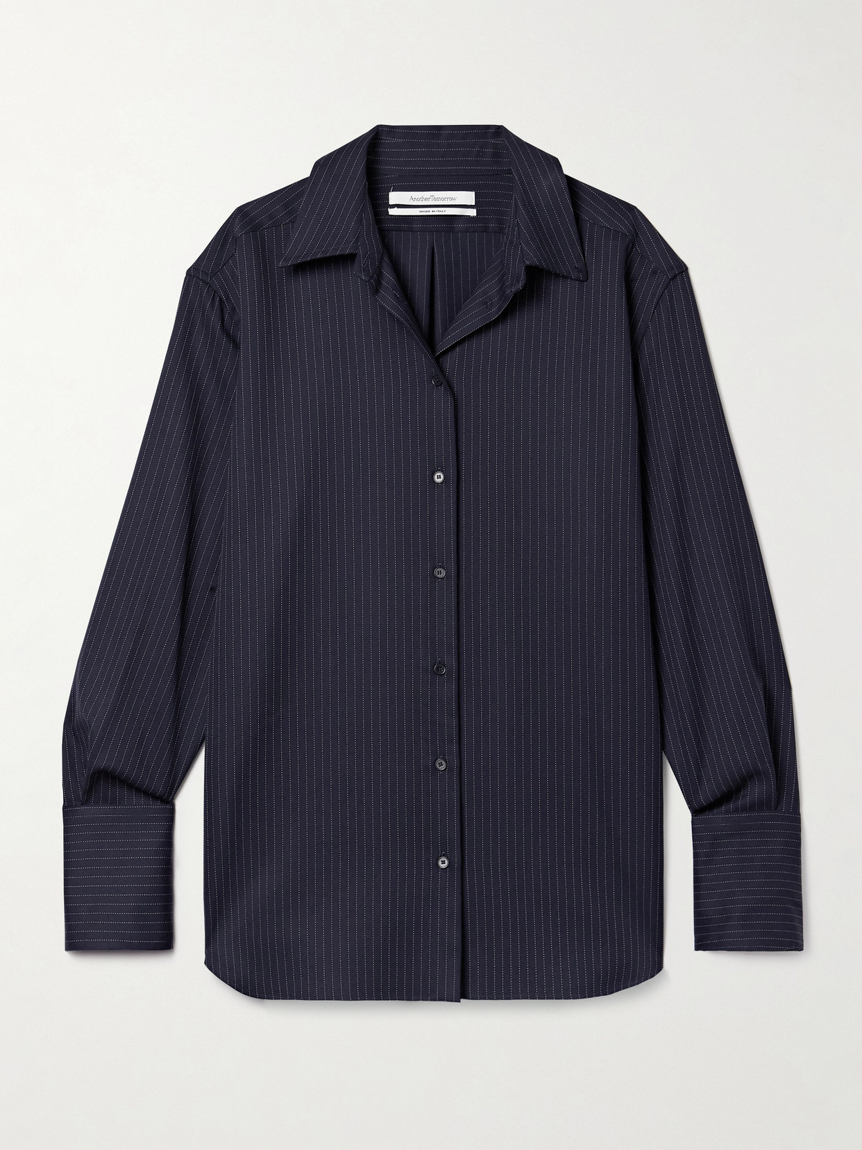 The Relaxed Shirt in Navy and Chalk by Another Tomorrow is crafted in a mid-weight wool twill featuring a curved hem and self covered buttons.. . . Their family-run farm partners across Australia, New Zealand, and Uruguay compassionately raise and shear their sheep in exemplary conditions, free of the cruel practice of mulesing.. 99% Wool, 1% Polyester. Made in Italy. Oversized silhouette. . Pair back to the matching Twill Trouser for a coordinated set..