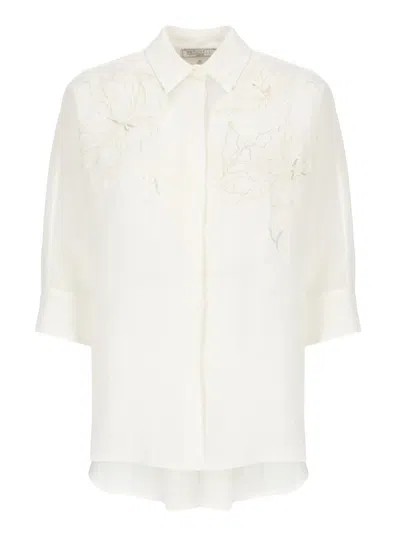 This white shirt by Antonelli Firenze reflects refinement with its blend of linen and silk. Featuring a classic collar and 3/4 sleeves with buttoned cuffs, it exudes elegance. The intricate embroidered details on the front enhance its artistic appeal. Soft and lightweight, this shirt is a versatile addition to any sophisticated wardrobe.- Material: Linen and silk blend- Collar: Classic- Sleeves: 3/4 with buttoned cuffs- Details: Intricate embroidery on the front- Feel: Soft and lightweight