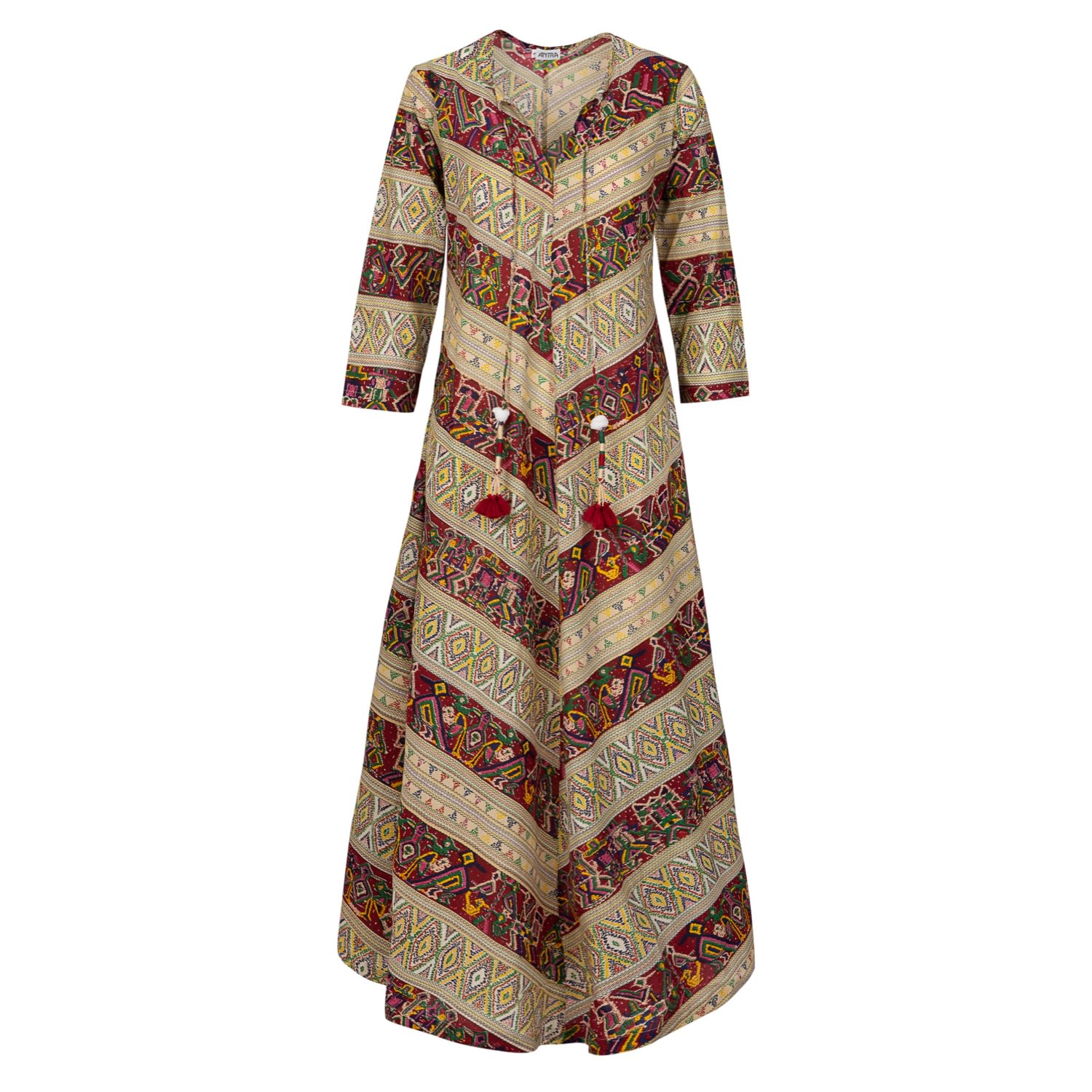 Inspired by the desert landscapes using uniquely designed fabric from India, this Peruvian-inspired Kaftan features a deep v-neckline with drawstring tassels will lend a glamorous and exotic feel to your holiday wardrobe. Thanks to the longer length fluted sleeves and maxi length this design is perfect to carry you from beach to bar for long summer evenings. 100% cotton Machine wash cold with like colours Low tumble dry