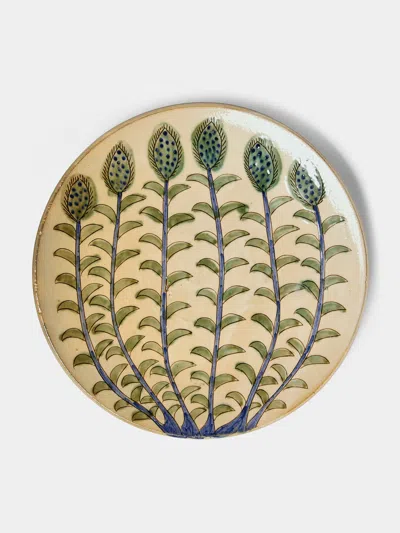 Botanical motifs feature throughout Anūt's pieces, like this striking ceramic serving platter. Uniquely hand painted in Egypt with washes of teal green and blue, it makes an impression in the dining room or as a piece of art on the walls. As this maker's designs are entirely made by hand, they may vary in size.