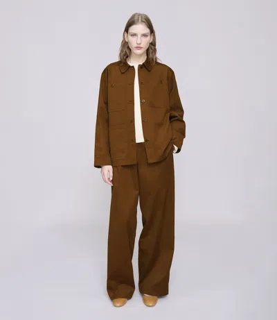 - Structured material. - Long, loose cut. - Mid-rise. - Permanent crease on the front and back. - Two side pockets and one back pocket. - Hidden buttoning.