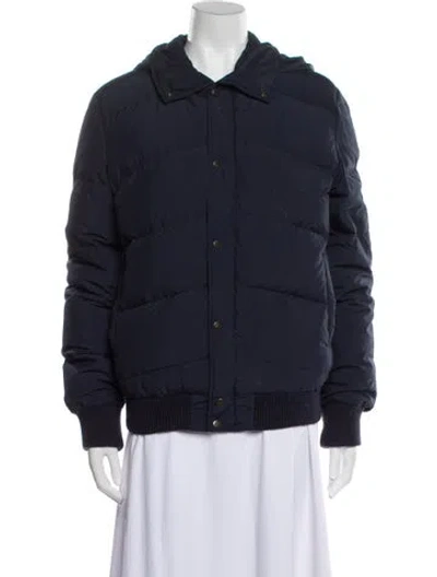 A.P.C. Down Coat Blue With Hood Pleated, Ruffle & Embroidered Accents Pointed Collar Short Slit Pockets & Snap Closure Fit: Coats by A.P.C. typically fit true to size. | A.P.C. Down Coat in Blue, Women's XS