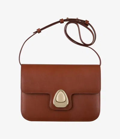 A.P.C. Women's bag. - Handbag with a jewelry-style clasp with 80s inspiration. - Soft cowhide leather. - Adjustable leather strap. May be carried on shoulder or across chest. - Goldtone magnetic clasp. - Flap lined in cowhide suede split. - Two compartments and one pocket on interior. - Embossed goldtone A.P.C. logo on clasp. - Available in a smaller version, the Astra Small bag.