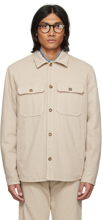 taupe cotton twill weave spread collar front button fastening long sleeves buttoned cuffs two front patch pockets embroidered logo to the front multiple internal slip pockets straight hem striped lining