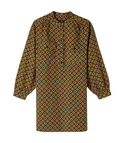 A.P.C. Women's dress. - Straight cut. - Mid-thigh length. - Mandarin collar with four mother-of-pearl buttons. - Two breast pockets with buttoned flaps. - Buttoned cuff. Gathered at wrist. - Original motif created by A.P.C. - 100% certified viscose produced from trees in sustainably managed forests.