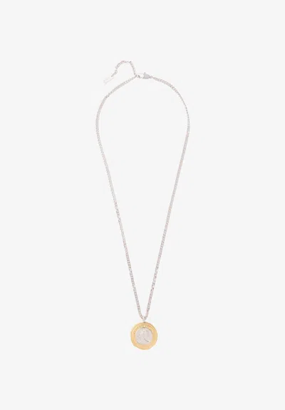 A.P.C. x Marc Jacobs interaction necklace. - Unisex jewelry. - Silver brass necklace.- A golden and silver coin with a portrait of Jean Touitou ‘Imp Jeanus Touitous' on the front and a portrait of Marc Jacobs ‘Imp Marcus Jacobus' on the back.- Carabiner clasp.