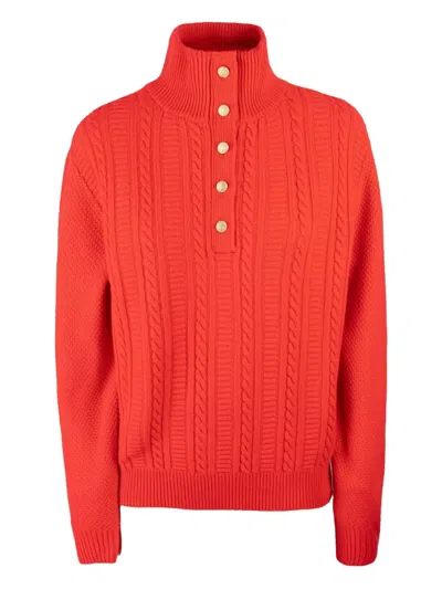 A vibrant red high-neck sweater showcases a textured cable knit pattern on the front. The straight-cut silhouette features ribbed edges and an elegant button closure with gold accents, exemplifying timeless craftsmanship. Ideal for casual occasions, this piece is made from 100% virgin wool, ensuring warmth and luxury. Color - Red Material - 100% Virgin Wool Style - High-neck Pattern - Textured cable knit Closure - Button with gold accents Silhouette - Straight-cut Edges - Ribbed