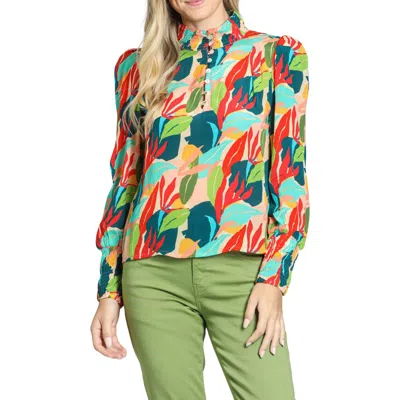 A carnival of colors patterns a puff-sleeve shirt crafted in a lightweight fabric. Button half placket High neck Long sleeves 64% cupro, 36% viscose Machine wash, tumble dry Imported Asian & Pacific Islander Owned/Founded