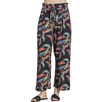 Enhance your wardrobe, featuring a high-rise design and a vibrant black multi-feather print. Boast a relaxed fit and wide-leg silhouette for ultimate comfort, complemented by an elastic back waistband and a chic self-tie belt. Pull on style. Machine wash cold, gentle cycle, hang to dry. Ideal for a boho chic summer look, they effortlessly transition from a casual beach day to a stylish evening out.