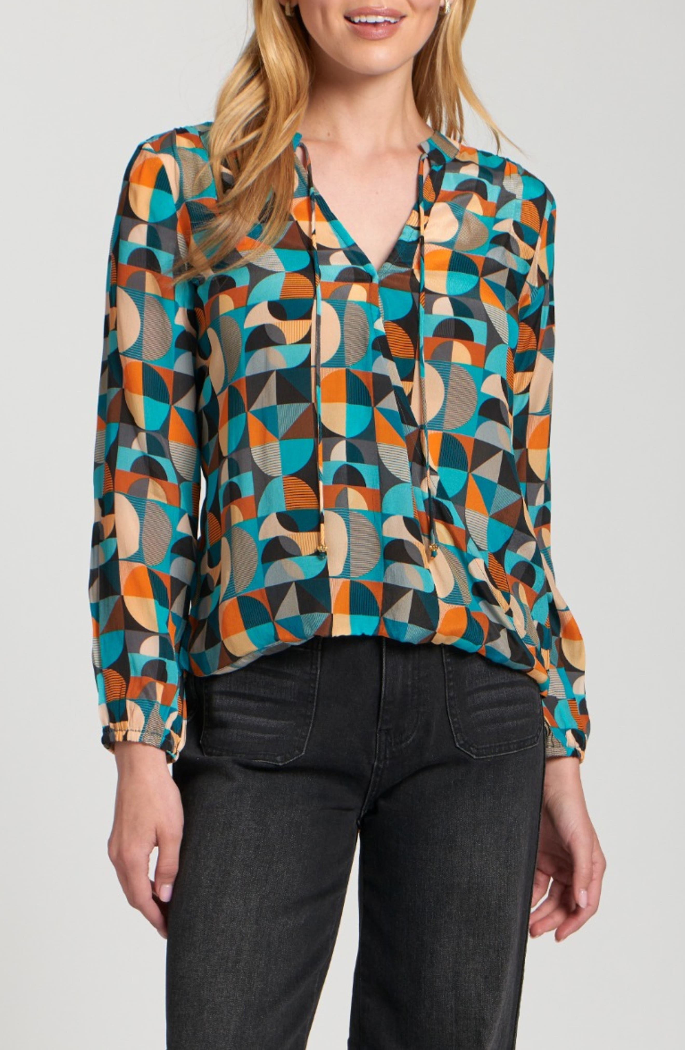 A pleat in the back lends superior drape to this floaty top with a bold print. 23" front length; 27" back length (size Medium) Split neck with ties Long sleeves with elastic cuffs 64% cupro, 36% viscose Machine wash, tumble dry Imported Asian & Pacific Islander Owned/Founded