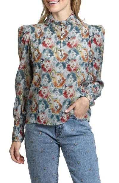 APNY Puff Shoulder Button Front Top In Grey Multi