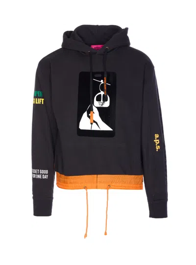 Apres Surf black Pordoi hoodie, print on the front, on sleeves and on the back, lateral zip detail, coulisse on waist, hood detail Composition: 80% Cotton, 20% Polyester