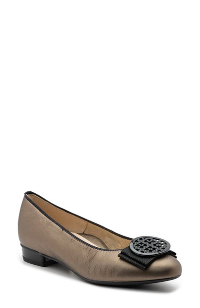 A lattice brooch rests on a flat grosgrain bow that dials up the elegance of this low-heel pump.