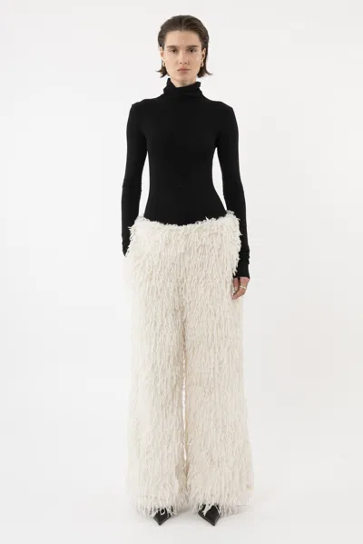: Introducing our Oversized Feather Pants. These pants balance lightness with sculptural volume. Made in a faux feather fabric, they feature adjustable ankle straps to shape the leg into a soft balloon silhouette, and internal waist ties for an adjusted fit. Finished with functional side pockets, they offer a clean understated attitude. Style with our Feather halter top for a complete dramatic look.