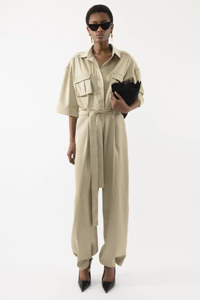 The Short Sleeve Jumpsuit is designed in a sleek pistachio green color with a subtle shine, balancing utility with minimalism. Designed for a relaxed fit, featuring a waist belt for definition, utility-style breast pockets, and functional back pockets. A modern one-piece that moves effortlessly between casual and elevated dressing.