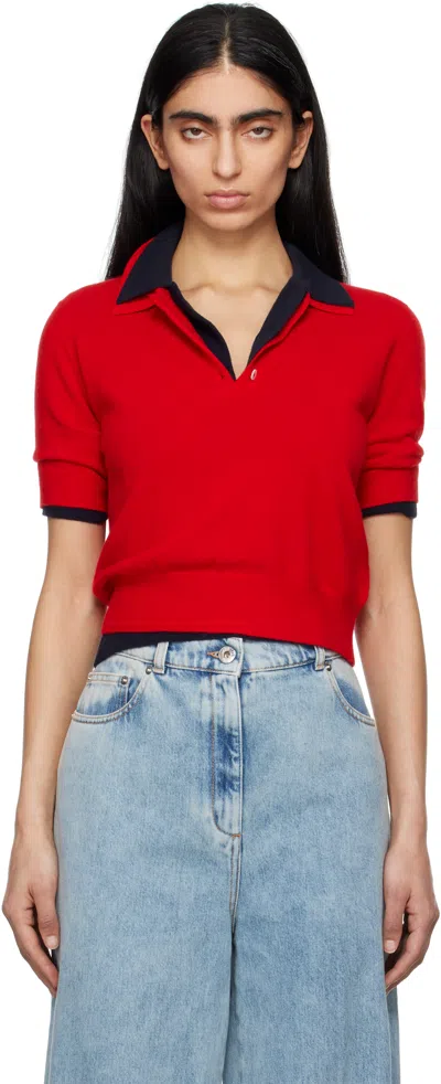 Knit GOTS-certified baby goat cashmere polo. · Rib-knit spread collar, hem, and cuffs · Three-button placket · Offset seam at shoulders Supplier color: Postbox red