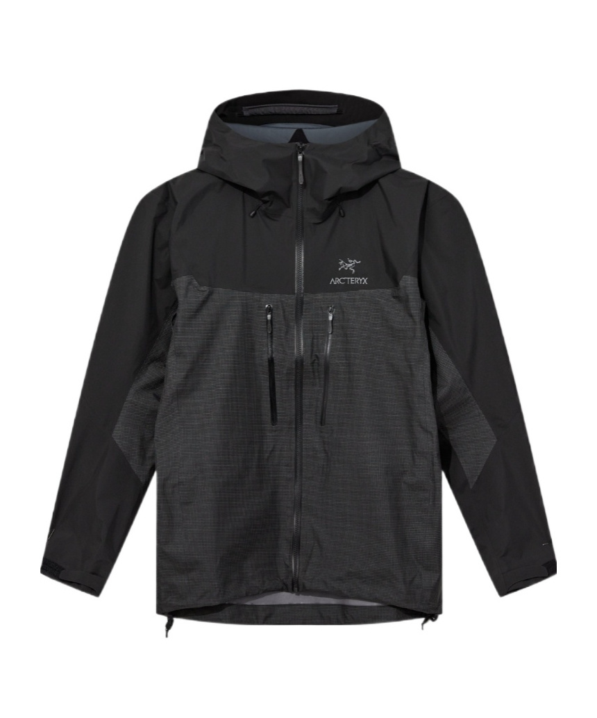 Arc'teryx jacke crafted from black GORE-TEX technical fabric, featuring a check pattern and a logo embroidery on the chest. Designed with a high collar, drawstring hood with a visor, front zip closure, zipped side pockets, long sleeves with adjustable cuffs, double-slider zips under the arms, a rounded hem with a drawstring and an unlined interior.