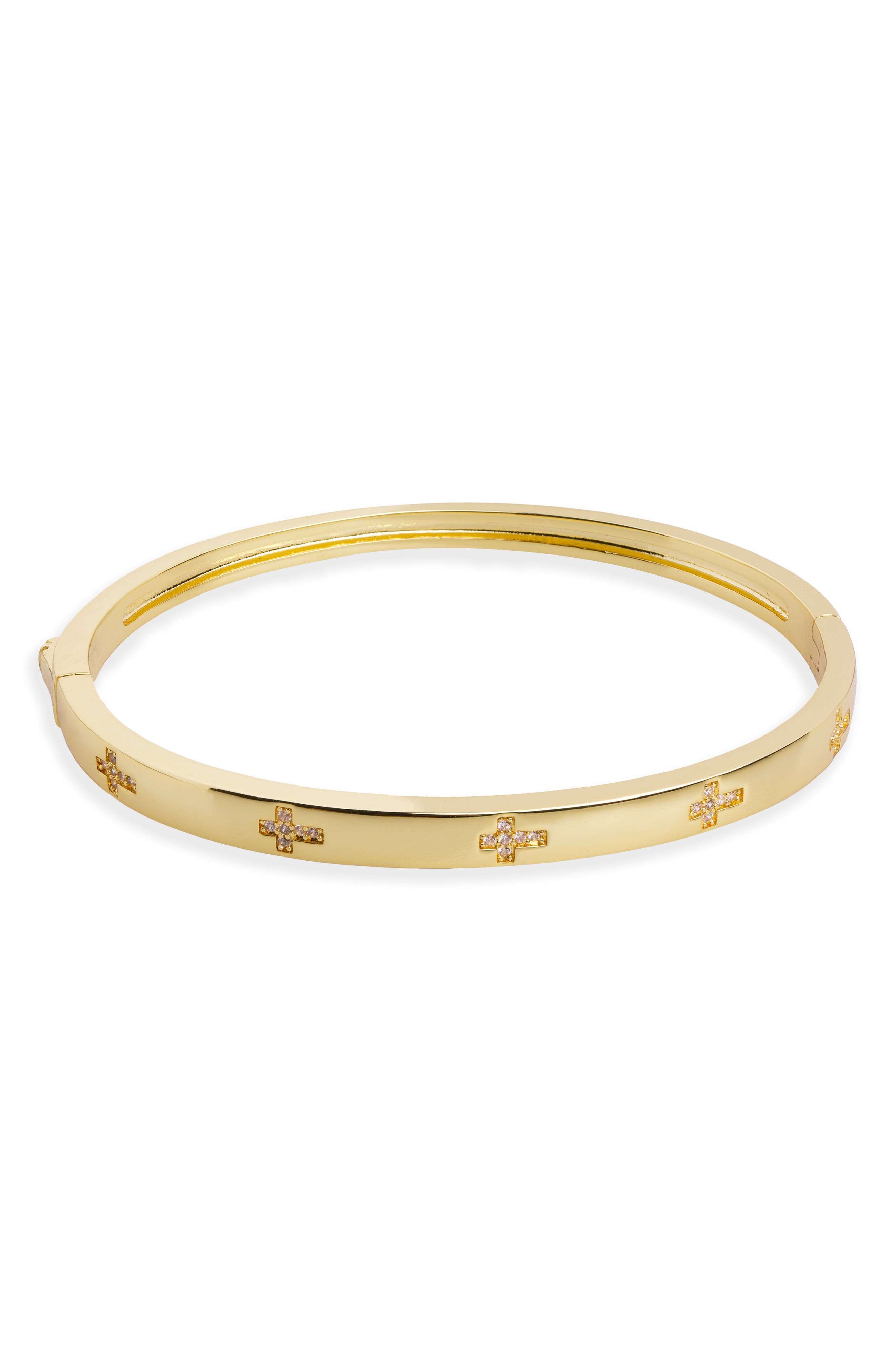 Cross cutouts beam with inset cubic zirconia along this sterling silver bangle plated with 18-karat gold. Push-clasp closure Sterling silver/18k-gold plate/cubic zirconia Imported