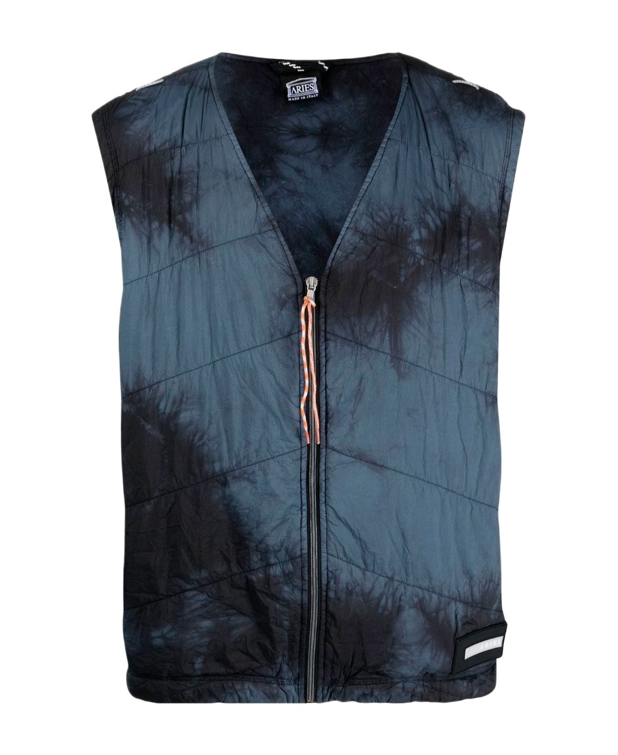 Tie-dyed vest, strap liner design, V-collar sewing finish, front zipper pocket and straight hem.
