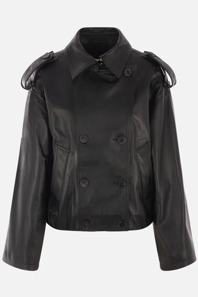 Arma double-breasted jacket crafted in black leather. Featuring wide lapels, front button closure, side pockets, long sleeves, epaulettes on the shoulders, an elasticated hem and a lined interior.
