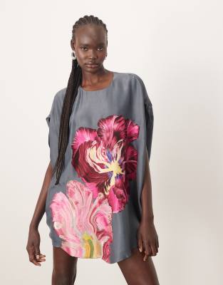 ARRANGE Distorted Floral Embroidered Cocoon Mini Dress In Gray