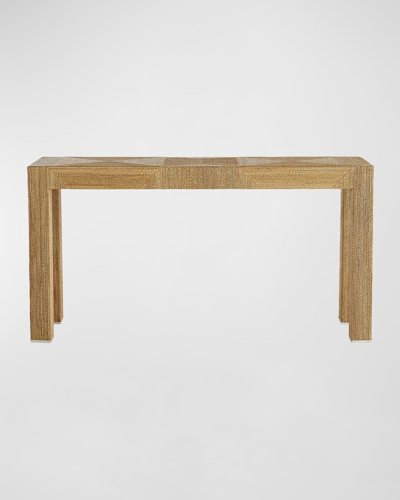 Natural woven rope creates a textural monochromatic pattern in the Palmetto Console. With parsons table lines and a monochromatic palette, the rope's braiding offers subtle tactile and visual interest. A versatile console, the Palmetto can serve as a desk sofa table or a console throughout a traditional or contemporary house. Handcrafted of rope around wood Overall, approx. 60"W x 16"D x 32"T Hardware not included Weight, 41.0 lbs Imported Boxed weight, approximately 65.0 lbs