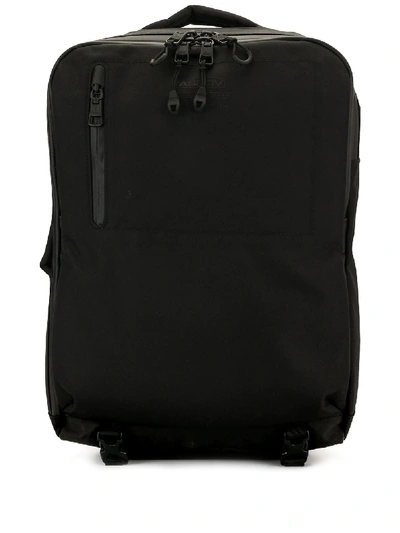 Black nylon canvas backpack from AS2OV featuring a top handle, a detachable and adjustable shoulder strap, a main internal compartment and a top zip fastening.