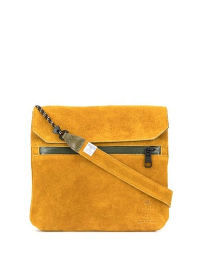 Mustard yellow suede flat shoulder bag from AS2OV featuring a detachable shoulder strap, a front zip compartment, an internal zipped pocket and a foldover touch strap fastening.